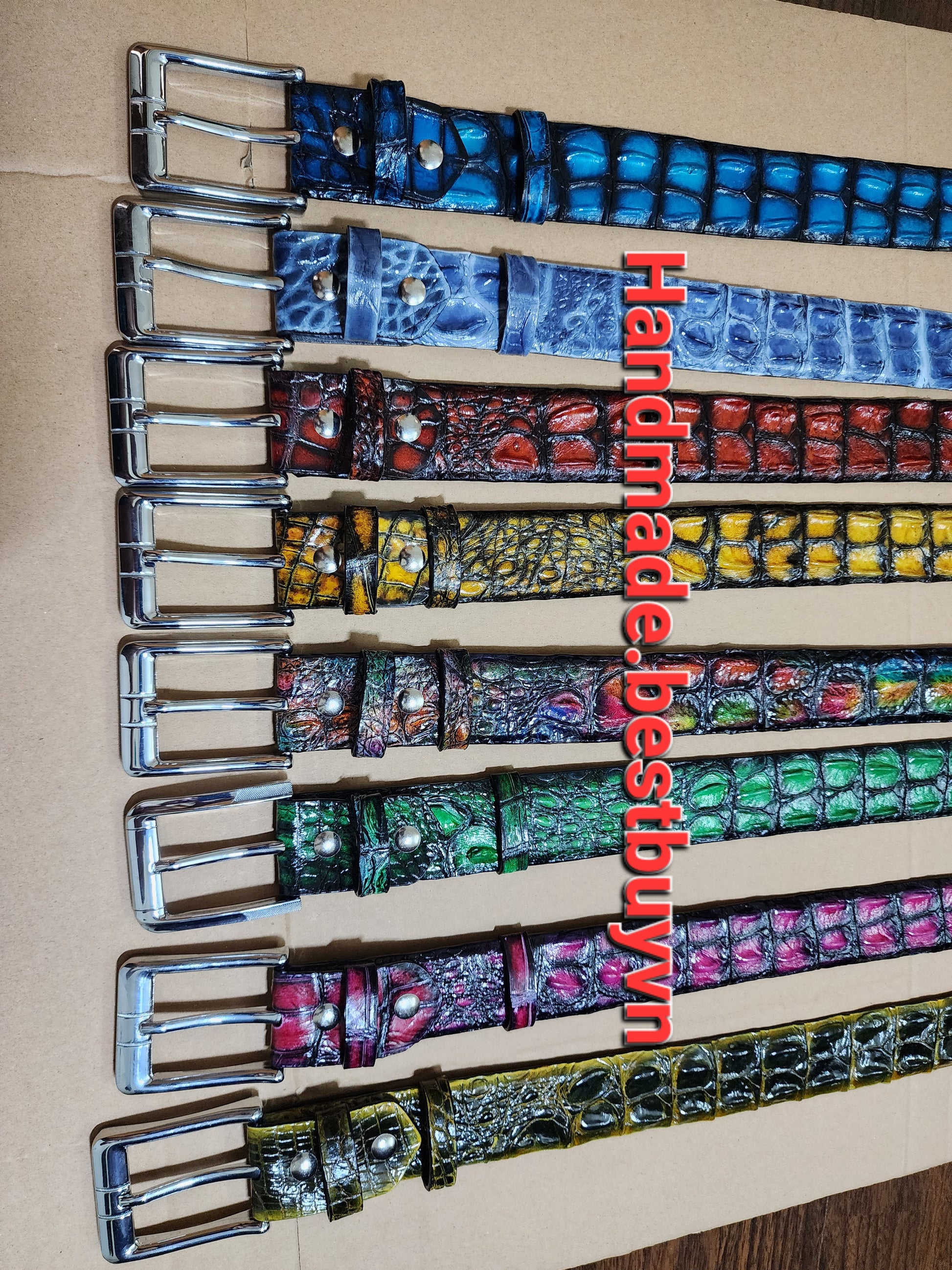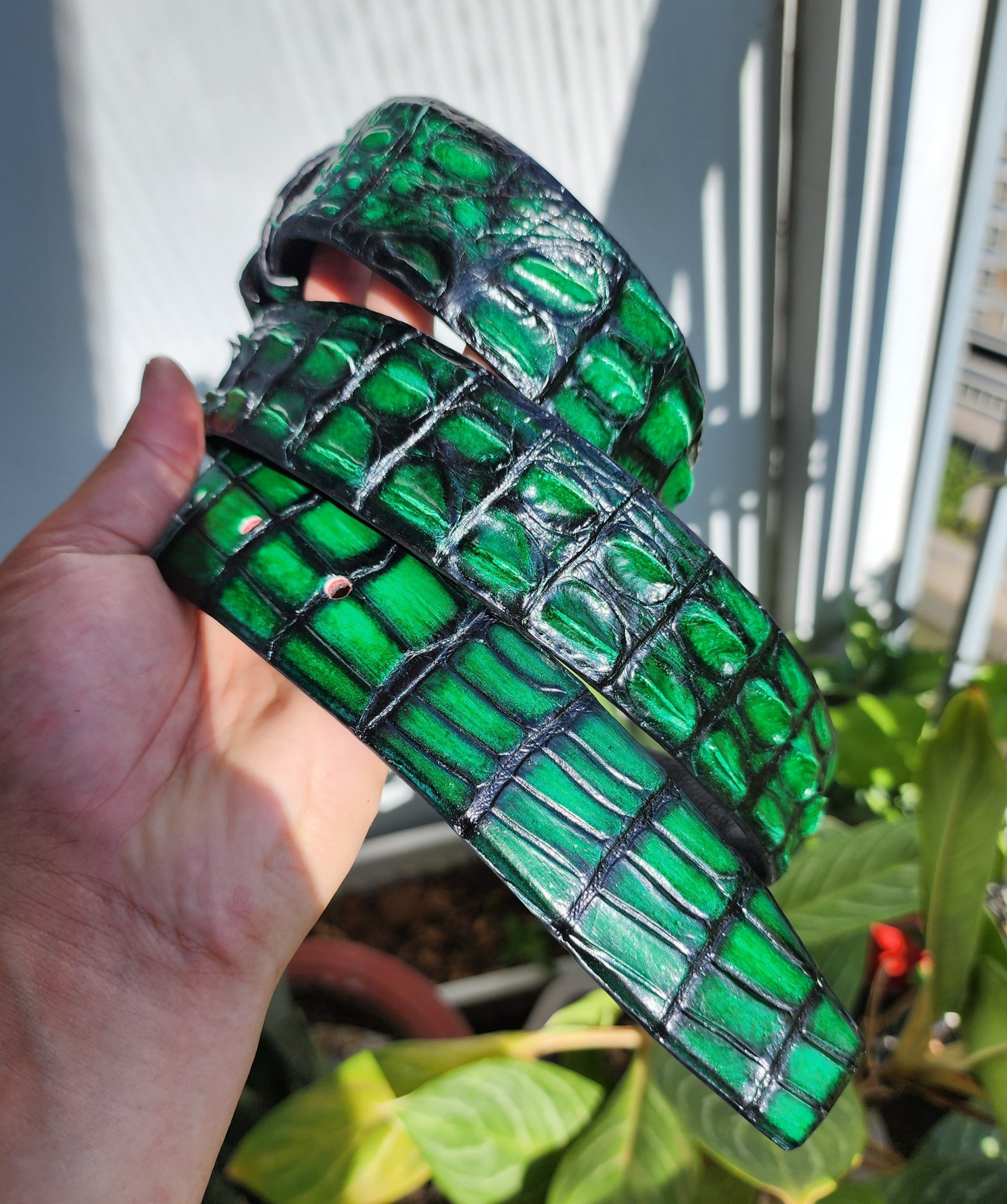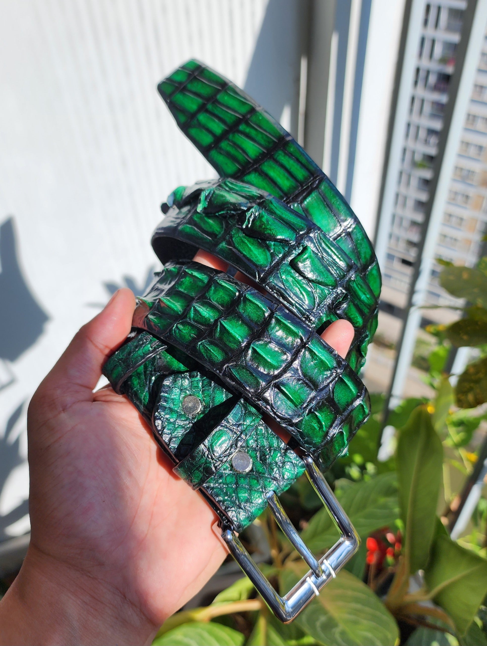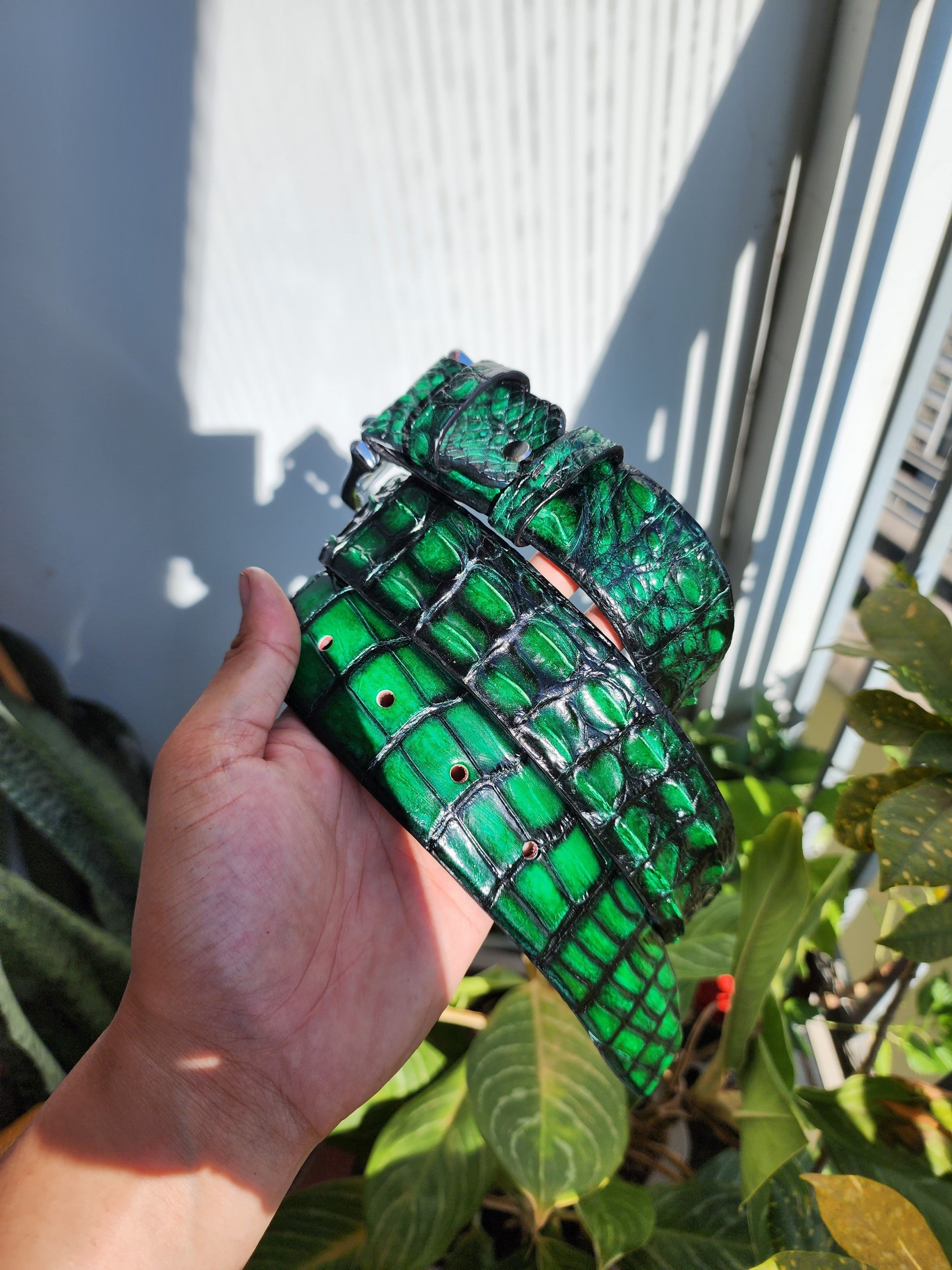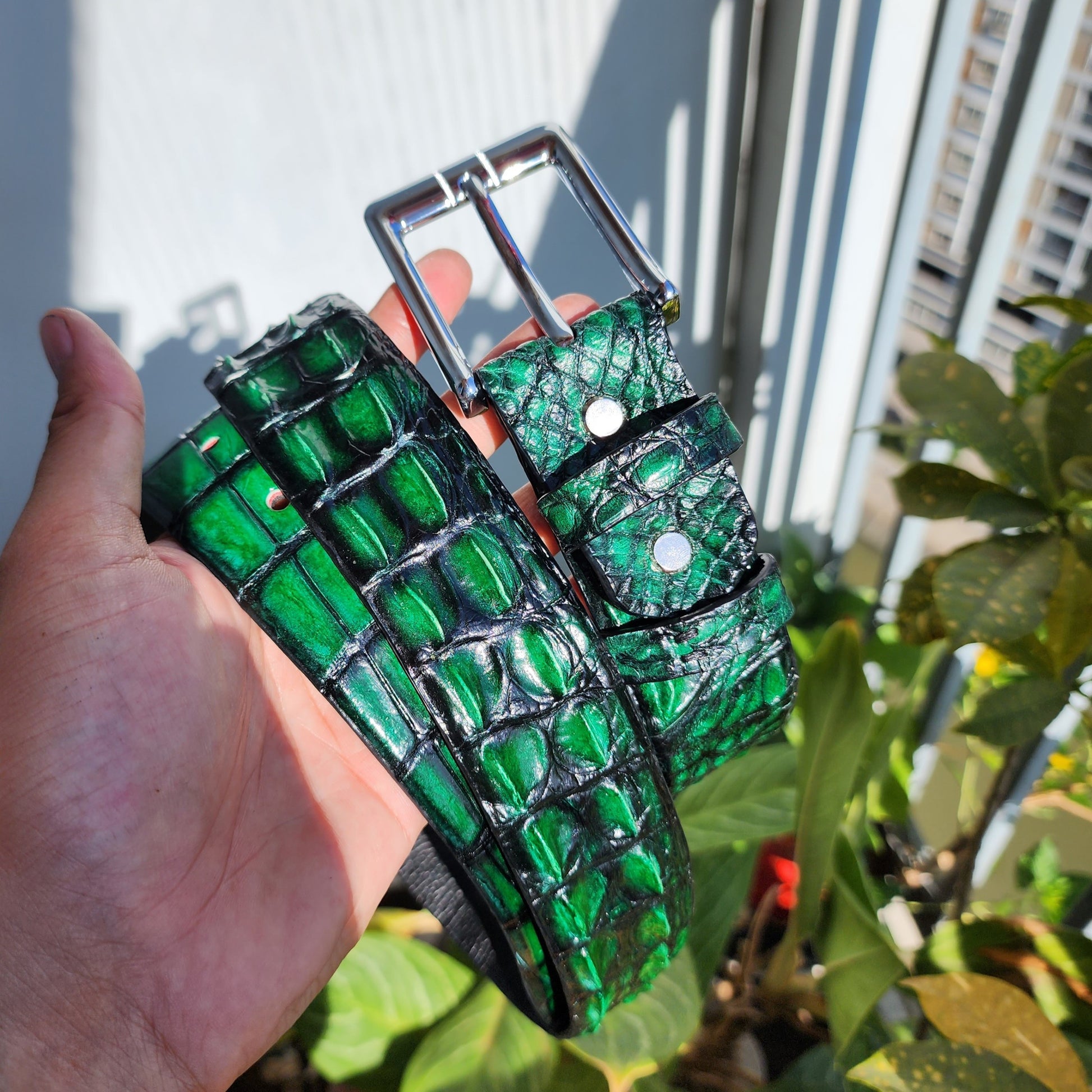 Patina Green Handmade Genuine Hornback Crocodile Leather Men Belt Buckle