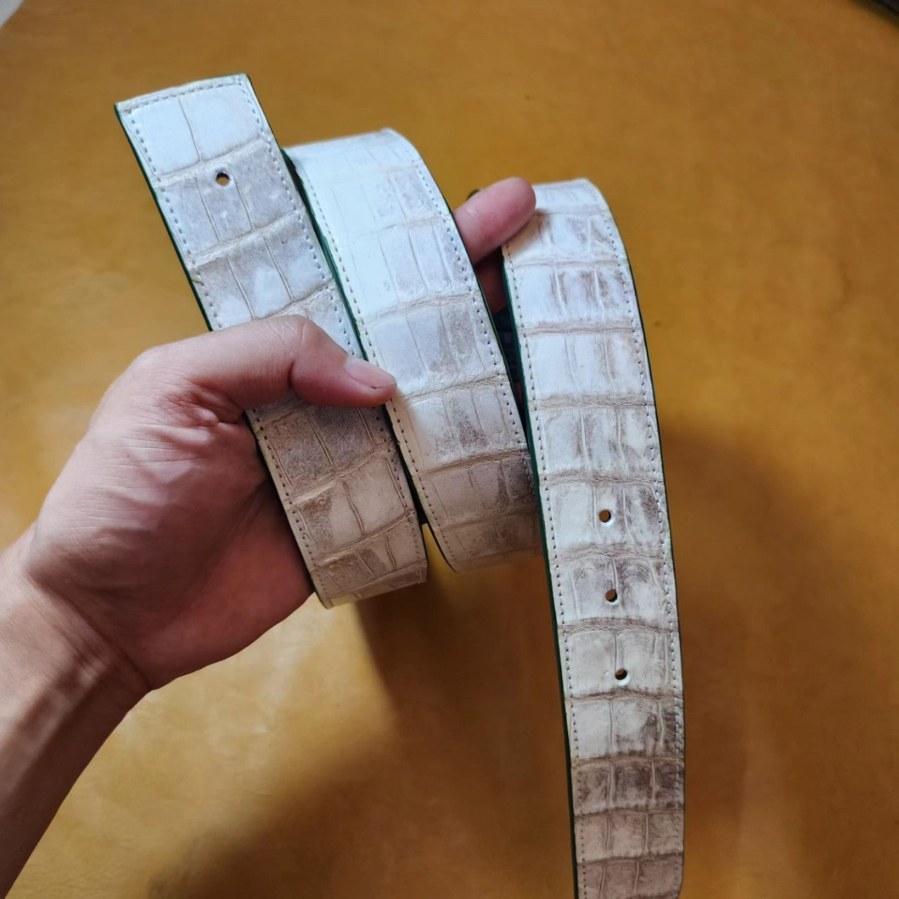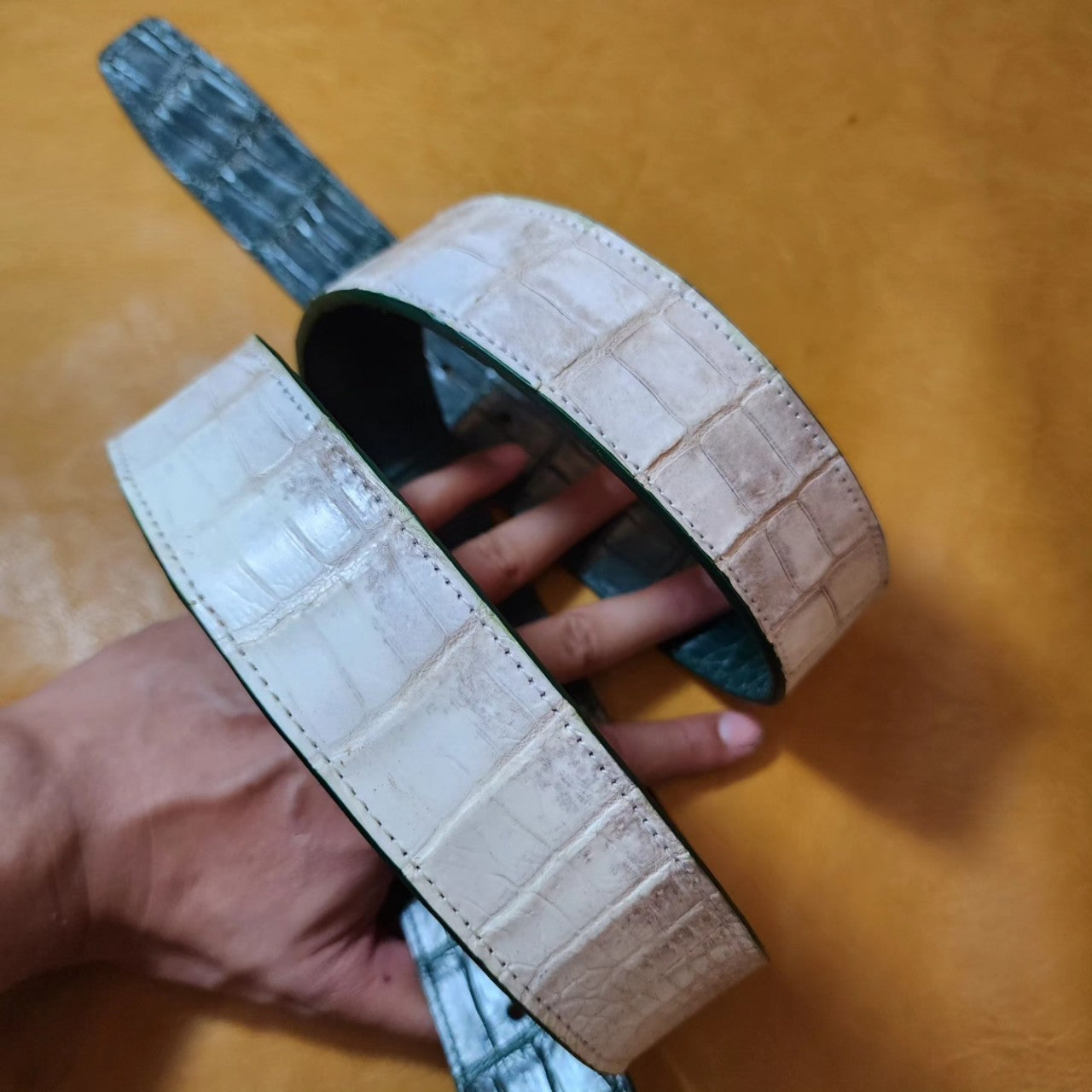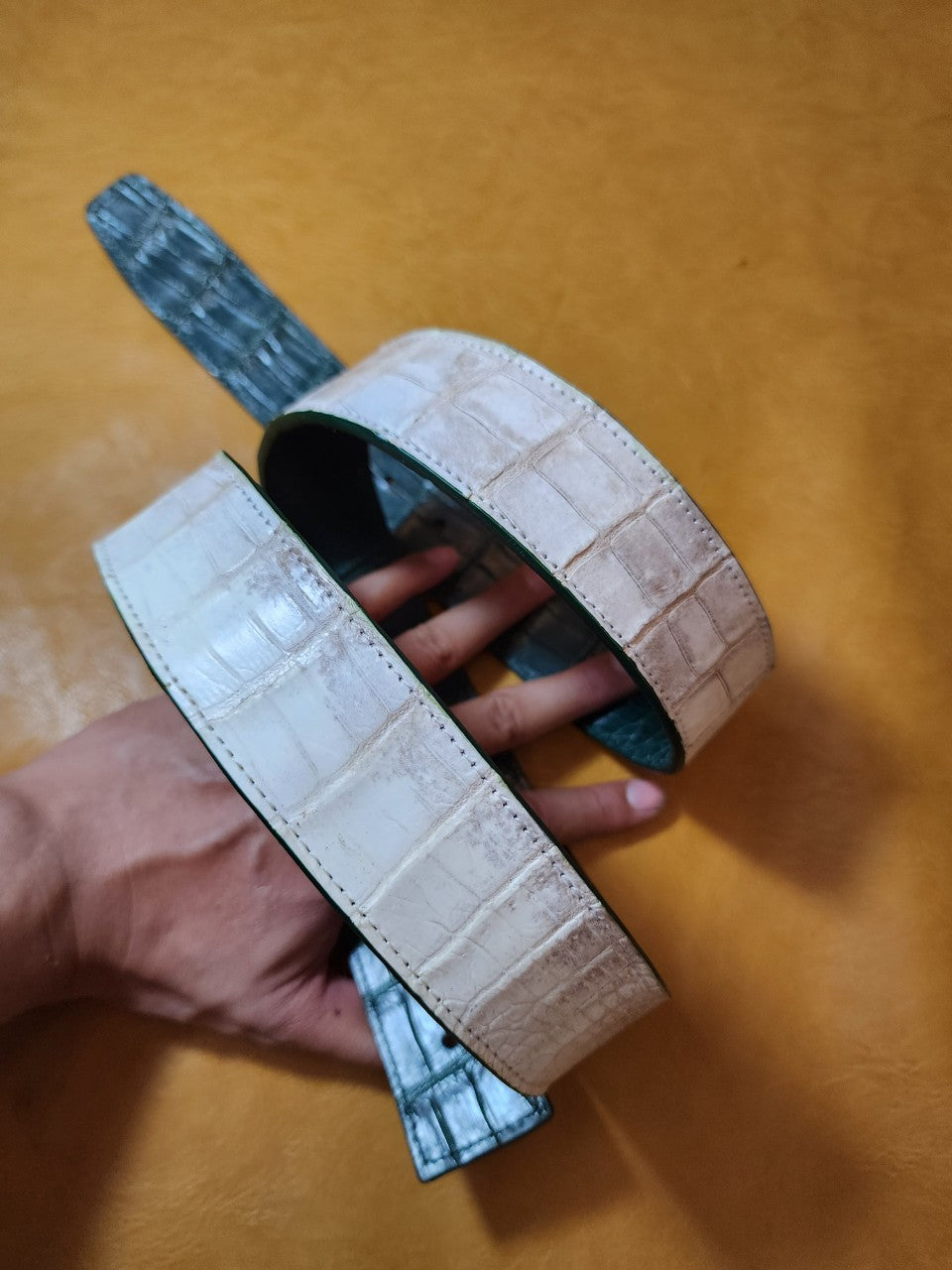 White/Green Doubleside 100% Genuine CROCO Leather Skin Men Belt H Buckle